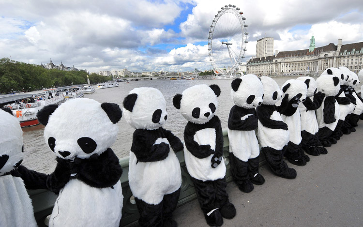 這些穿著黑白套裝扮演熊貓的表演者當(dāng)天在考文特花園(Convent Garden)拉開首個“大熊貓關(guān)注周”的序幕,旨在引起人們關(guān)注這種瀕危動物的境況。