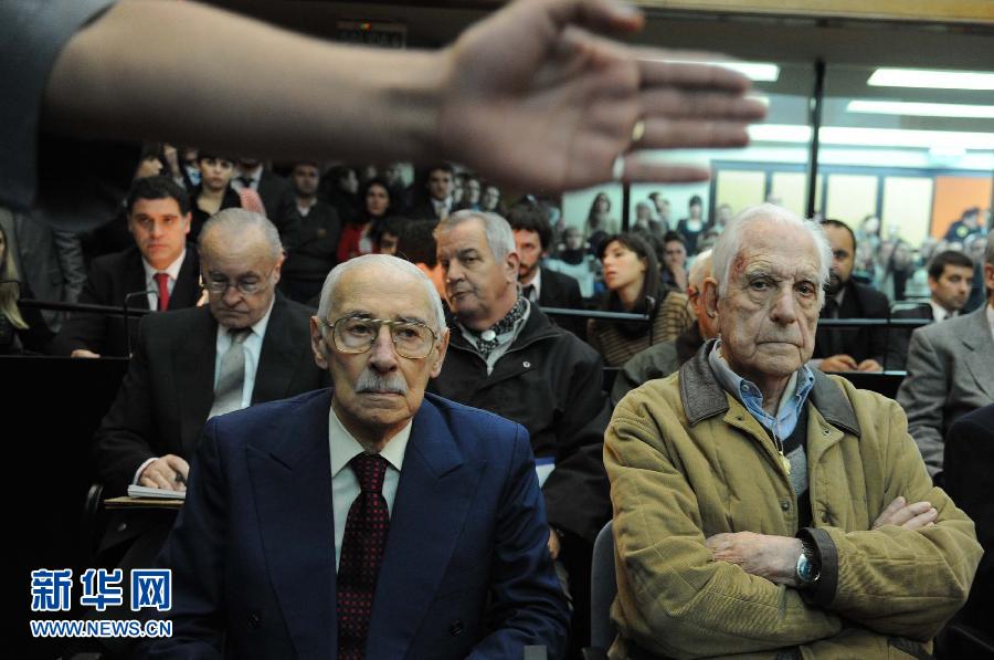7月5日,在阿根廷首都布宜諾斯艾利斯,阿前總統(tǒng)魏地拉(前左)和比尼奧內(nèi)(前右)在法庭聽候宣判。阿根廷多名前獨(dú)裁政權(quán)高級軍政官員盜走數(shù)百名在押人員的子女,交由他人收養(yǎng)。案件從立案到庭審歷時14年,法庭當(dāng)日分別判處兩名前總統(tǒng)50年和15年監(jiān)禁。新華社/美洲通訊社