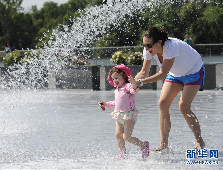 7月6日,在美國首都華盛頓,一位婦女帶著孩子在一處噴泉戲水納涼。 連續(xù)數(shù)天來,美國中部平原至大西洋沿岸中部大片地區(qū)遭遇酷暑天氣。新華社記者張軍攝