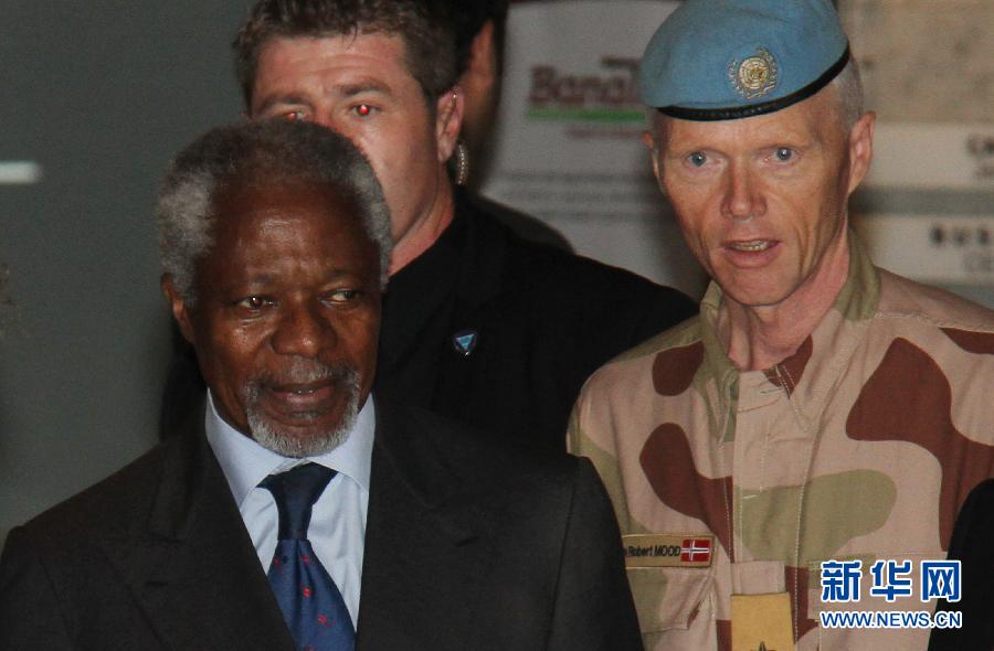 7月8日,聯(lián)合國-阿盟敘利亞問題聯(lián)合特使安南(前左)抵達(dá)敘利亞首都大馬士革。當(dāng)天,安南抵達(dá)大馬士革,他將就和平計劃的執(zhí)行情況與敘利亞官員再次進(jìn)行磋商。 新華社發(fā)(哈西姆攝)