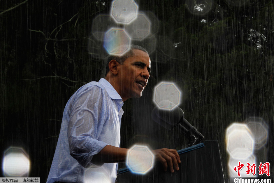 當(dāng)?shù)貢r(shí)間2012年7月14日,美國(guó)總統(tǒng)奧巴馬在維吉尼亞州參加競(jìng)選活動(dòng),發(fā)表演講時(shí)突降大雨。