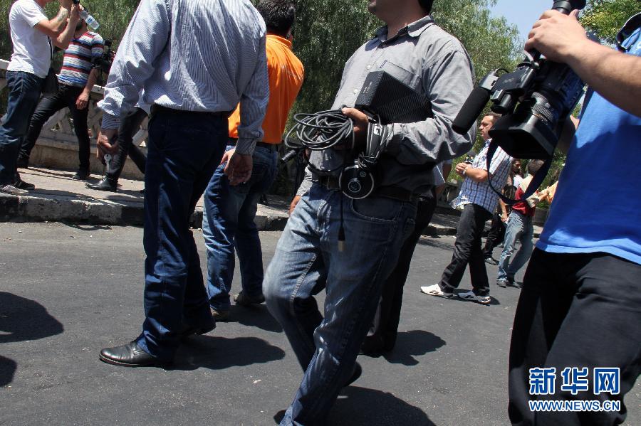 7月18日,在敘利亞首都大馬士革,記者聚集在發(fā)生爆炸的敘利亞國家安全總部附近。據(jù)敘利亞通訊社18日?qǐng)?bào)道,位于首都大馬士革的敘利亞國家安全總部當(dāng)天上午遭到自殺式爆炸襲擊,敘國防部長拉杰哈遇襲身亡,另有多名政府高級(jí)官員受傷。新華社發(fā)(哈澤姆攝)