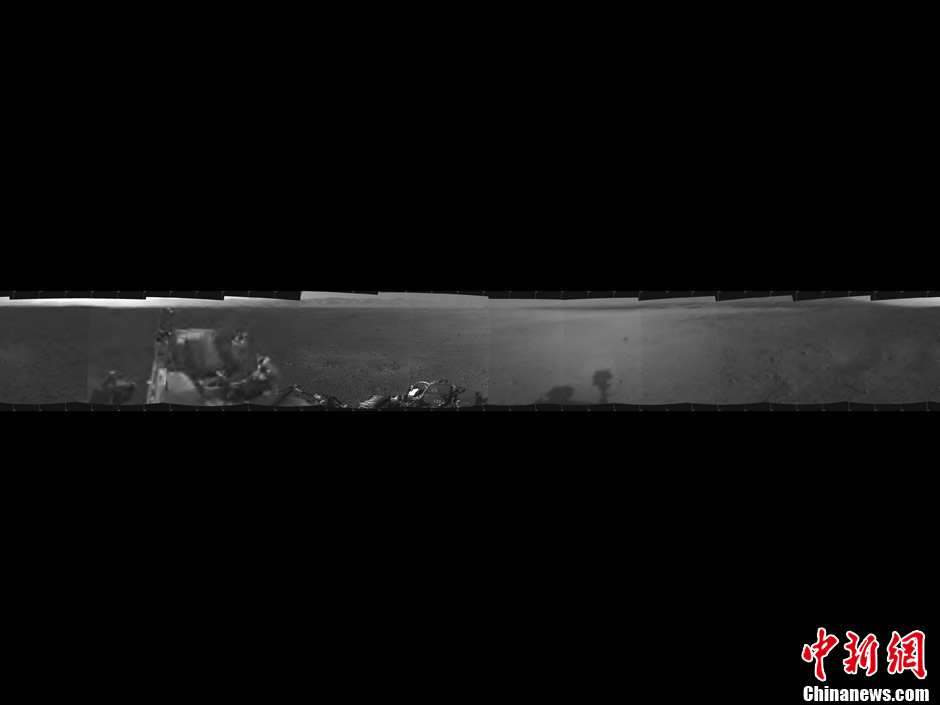 這是“好奇”號利用導(dǎo)航相機所拍照片繪制的第一幅360度全景圖。全景圖所使用的絕大多數(shù)照片都是縮略圖或者全分辨率照片的壓縮版,尚未傳回地球。處在全景圖中部附近的兩幅照片便是全分辨率照片。夏普山處在右側(cè),蓋爾隕坑北側(cè)邊緣處在中央,“好奇”號處在前景,桅桿的影子處在右側(cè)。美國“好奇”號火星探測器于北京時間8月6日在火星成功著陸。圖片來源:NASA