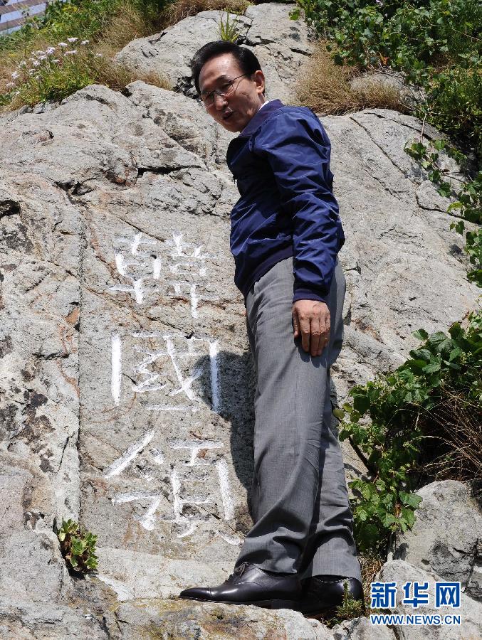 8月10日,韓國總統(tǒng)李明博登上與日本存在主權爭議的獨島(日本稱竹島),仔細觀看一塊刻有“韓國領”字樣的巖石。