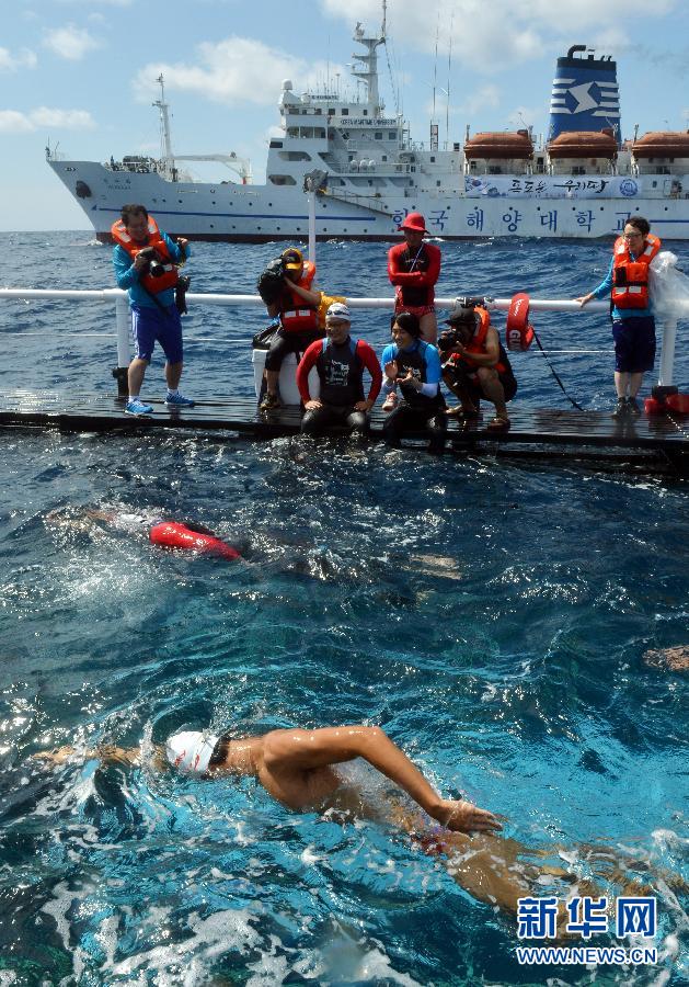 8月14日,韓國歌手金章勛率領(lǐng)的游泳隊(duì)隊(duì)員在進(jìn)行游泳接力。 8月13日,韓國歌手金章勛帶領(lǐng)一支由40名大學(xué)生和其他隊(duì)員組成的游泳隊(duì),啟動(dòng)了一項(xiàng)由韓國東部港口到與日本存在主權(quán)爭議的獨(dú)島(日本稱竹島)的游泳接力。他們預(yù)計(jì)于8月15日光復(fù)節(jié)下午登上獨(dú)島(日本稱竹島)。新華社/紐西斯通訊社