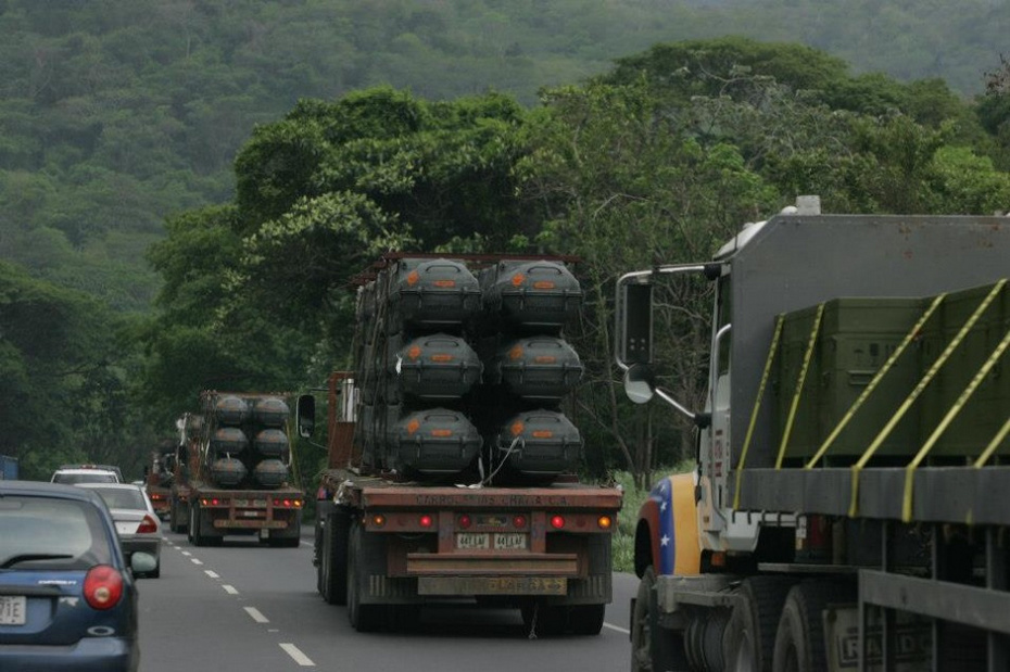 俄羅斯一批出口型山毛櫸-M2E防空系統(tǒng)攔載彈運(yùn)抵委內(nèi)瑞拉。該批導(dǎo)彈由數(shù)輛重型卡車(chē)在港口裝車(chē)后通過(guò)公路運(yùn)往目的地。