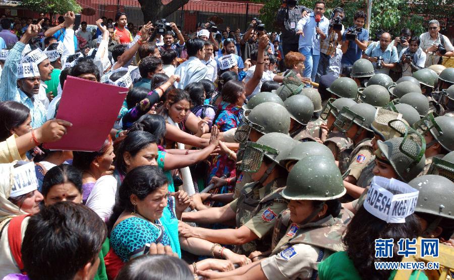4月22日,在印度首都新德里,人們參加針對強(qiáng)奸女童事件舉行的抗議活動時試圖沖破警方的路障。