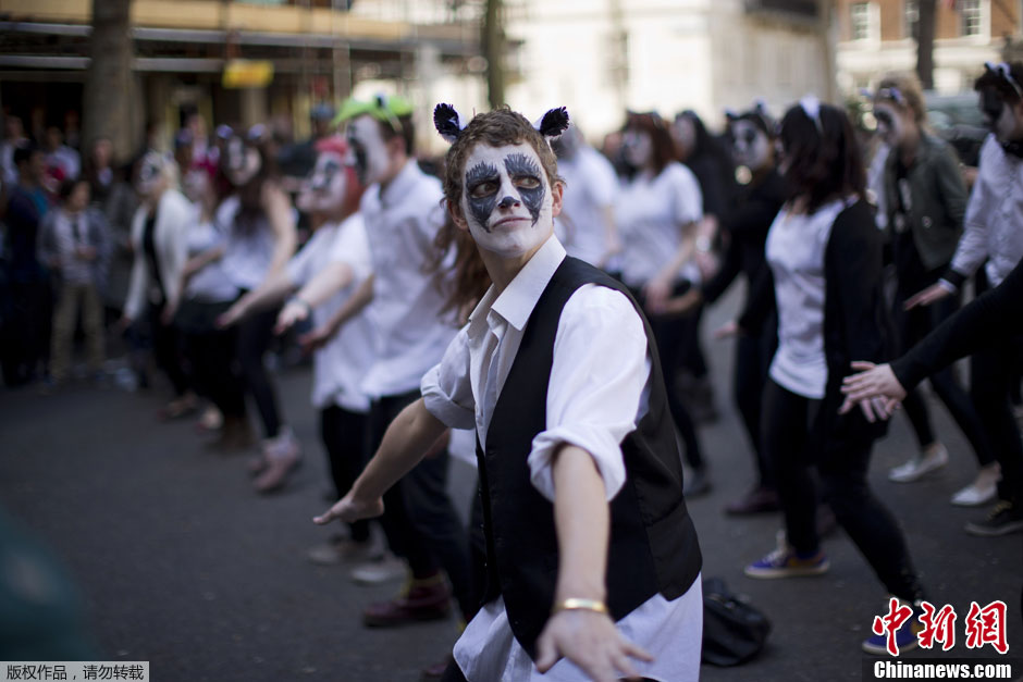 當?shù)貢r間5月1日,英國倫敦,動物保護志愿者進行面部彩繪裝扮成動物“獾”,在英國環(huán)境、食品和農(nóng)村事務(wù)部(DEFRA)外舉行示威集會并進行“快閃”,抗議剝?nèi)♀灯っ男袨椤?/p>