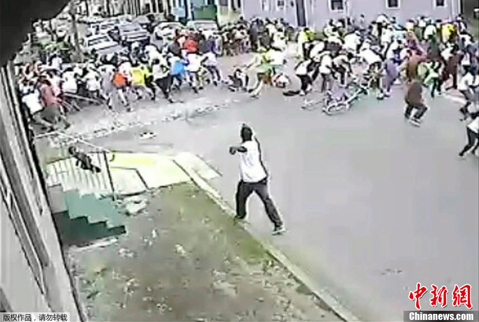 當(dāng)?shù)貢r間2013年5月12日,美國新奧爾良市,監(jiān)控攝像頭拍下的母親節(jié)槍擊事發(fā)過程。美國新奧爾良市當(dāng)天舉行的母親節(jié)游行遭遇槍擊事件,目前已致19人受傷。警方已鎖定19歲的嫌犯阿克恩·斯克特(畫中白衣者)。