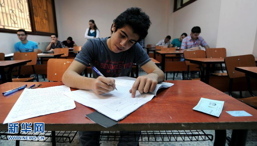 6月2日上午,在敘利亞首都大馬士革馬薩區(qū)穆罕默德·薩拉赫·丁·哈卜吉考場,考生參加物理考試。伴隨窗外的隆隆炮聲,為期兩周的敘利亞全國高考當日拉開序幕,考生將參加文、理科以及醫(yī)學類多科目考試。有175名學生在大馬士革馬薩區(qū)穆罕默德·薩拉赫·丁·哈卜吉考場參加考試?紙鲐撠熑藖單鳡枴 瓦素夫介紹說,每個教室安排15名考生,3名監(jiān)考老師。按照敘利亞教育部門的規(guī)定,考試中考生嚴禁使用手機,一經(jīng)發(fā)現(xiàn),將取消考試資格,而考生使用過的答題紙也將隨試卷一同收回。由于目前敘利亞國內局勢復雜,有關部門將適時發(fā)布考試和招生信息。新華社記者張迺杰攝