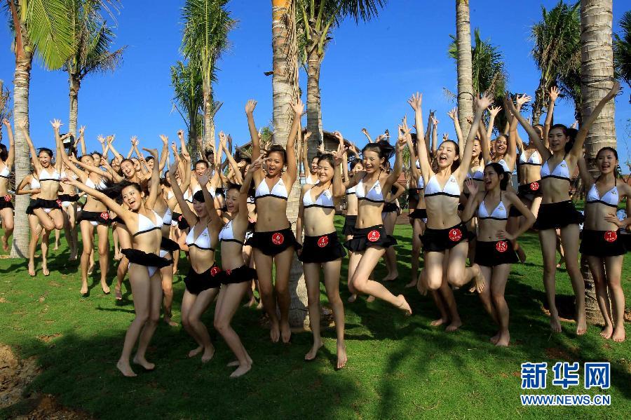 12月8日,正在海南參加“2011第十九屆新絲路中國模特大賽總決賽”的佳麗們在三亞拍攝集體泳裝照。