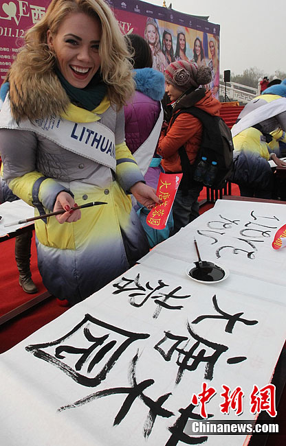 12月22日,正在陜西西安參加2011國(guó)際旅游小姐冠軍賽的各國(guó)佳麗來(lái)到西安大唐芙蓉園游覽,各國(guó)佳麗與當(dāng)?shù)貢?shū)法家一起練習(xí)書(shū)法。中新社記者 錢(qián)興強(qiáng) 攝