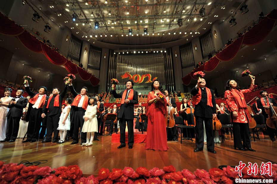 “龍鳳呈祥——全球華人新春音樂盛典2012”由著名指揮家陳佐湟、呂嘉執(zhí)棒國家大劇院管弦樂團演奏。管風(fēng)琴家沈凡秀、笛子演奏家戴亞、鋼琴演奏家居覲、小提琴演奏家呂思清、男中音歌唱家袁晨野等海內(nèi)外知名的華人藝術(shù)家獻上了精彩演出。許戈輝、竇文濤、沈星和尉遲琳嘉擔(dān)任音樂盛典司儀。圖為謝幕后藝術(shù)家向觀眾致意。中新網(wǎng)記者 金碩 攝