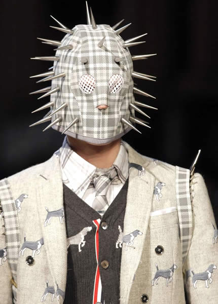 記者朱盈庫報道,在日前進行的巴黎時尚周的一次時裝展覽上,美國設計師桑姆·布郎尼 (Thom Browne)和比利時設計師Walter Van Beirendonck展出了他們創(chuàng)作的怪異服裝。兩位設計師給作品加入了離奇怪異的元素,他們用帽子和面具掩蓋住一些模特的面部,增添了搞怪效果。