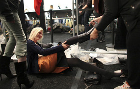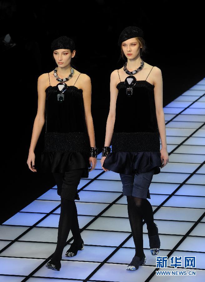 2月25日,在意大利米蘭秋冬女裝時裝周上,模特展示意大利高級時裝品牌Emporio Armani服飾。Emporio Armani是阿瑪尼以年輕人為主的副線品牌。 新華社記者王慶欽攝