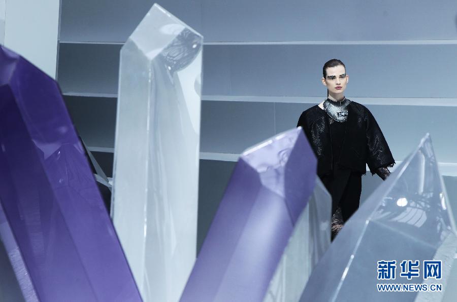 3月6日,模特在法國(guó)巴黎時(shí)裝周上展示香奈兒2012/2013秋冬新品。當(dāng)日,香奈兒總設(shè)計(jì)師卡爾·拉基菲爾德將法國(guó)巴黎大皇宮裝扮成“水晶巖洞”,上百根大小不同、顏色各異的水晶柱形狀飾品以各種形態(tài)豎立在伸展臺(tái)上,模特身著以“水晶概念”為主題的香奈兒最新春裝,穿梭在“水晶”世界中。新華社記者高靜攝