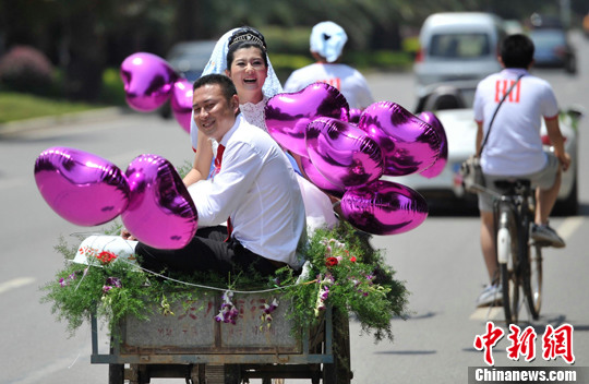 5月12日,云南省蒙自市的一名80后年輕人,用1輛三輪車和8輛“二八”自行車組成的個性迎親車隊,接回了自己的漂亮新娘。中新社發(fā) 劉冉陽 攝