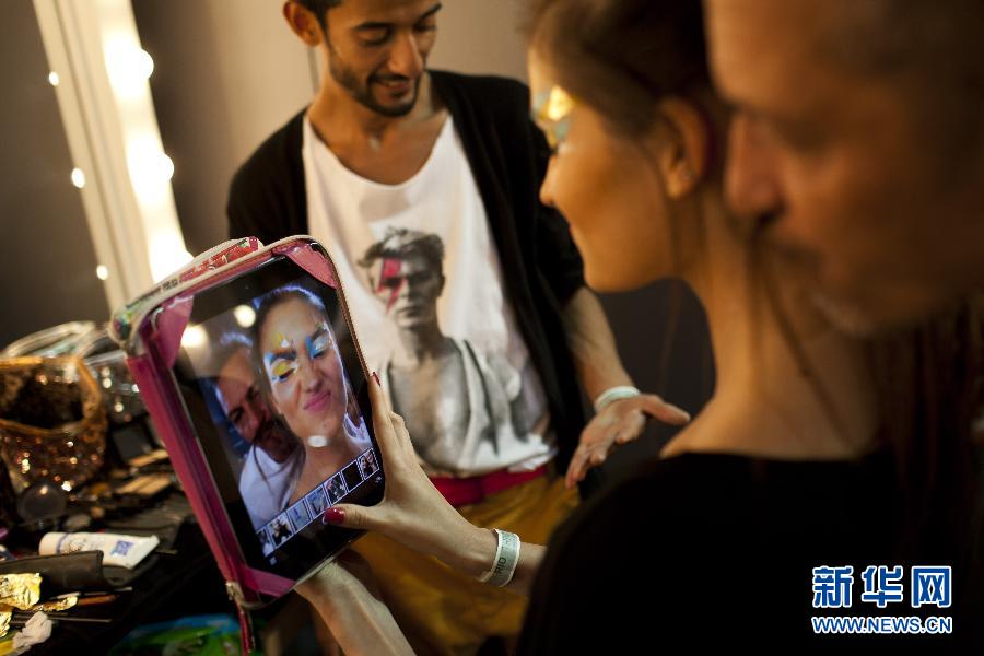 5月26日,在巴西里約時裝周上,一名模特化妝完畢后自拍。 新華社/美聯(lián)