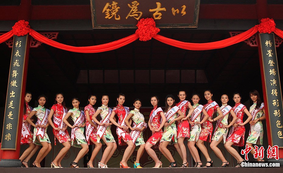 6月17日,正在河南鄭州清華憶江南參加2012環(huán)球比基尼小姐大賽華中賽區(qū)總決賽的44位佳麗,與河南旗袍會聯(lián)手舉行一場別開生面的旗袍秀。中新社發(fā) 錢興強 攝
