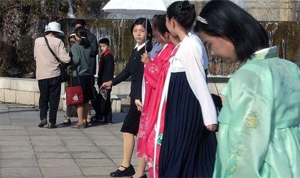 朝鮮人的衣著穿戴顯然沒有我們國內那么五彩繽紛和講究美感,但也不是想像中那樣是單一的人民服、清一色黃色。這樣的職業(yè)女性街頭很常見,裊裊婷婷,女孩子沒有留披肩長發(fā)的,更沒有梳碎發(fā)、染發(fā)的。