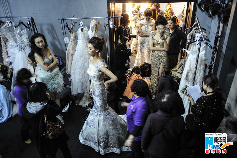 2012年10月30日,即將登場(chǎng)的各位模特在后場(chǎng)準(zhǔn)備。新華網(wǎng) 李欣 攝