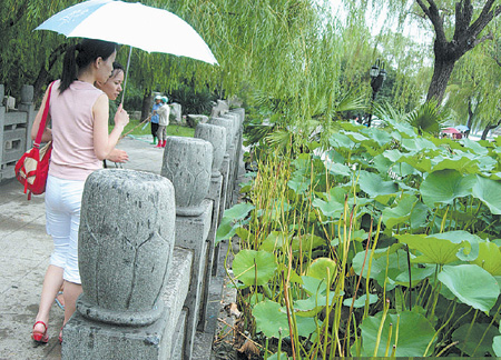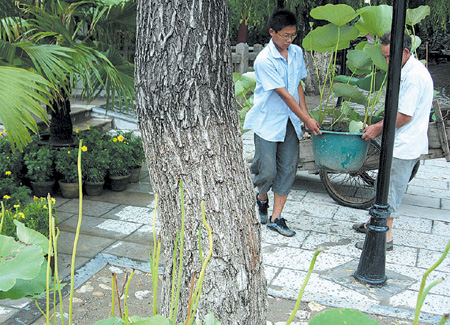 生活日報8月5日訊(記者 趙國陸)眼下,正在舉辦荷花節(jié)的大明湖憑借“四面荷花三面柳”的獨特美景令四海游客陶醉,然而由于一些游客隨意采摘,靠近湖岸的荷葉大部分遭到了“滅頂之災”,成了禿頂?shù)墓鈼U子,殘荷讓大明湖景色大打折扣。據(jù)了解,不僅湖里的荷葉被大量摘頂,就連盆栽荷花也損失慘重,500多盆被摘光,以至于公園都沒有備用荷花可換了。 目前,隨著荷花的大量盛開,大明湖進入“四面荷花三面柳”的美景時節(jié),前來觀賞游覽的游客絡(luò)繹不絕。記者今日在湖邊看到,靠近岸邊的荷葉幾乎全被游人摘走,只剩下殘破枯萎的荷梗。 在北岸一座橋的兩側(cè),擺滿了盆栽的觀賞荷花,但手夠得著的地方全部“禿頂”,荷花全沒了,荷葉也所剩無幾,與遠處枝繁葉茂的荷花形成極大的反差。從上海來濟南游覽的呂小姐深深地被大明湖的景色吸引,本想與荷花“親密接觸”,拍照留影,看著滿目的殘葉枯梗,遺憾地說:“太可惜了! 在鐵公祠附近有一些大荷葉,幾名小游客竟將其當成了“靶子”,將手里的飲料瓶等往上面扔,F(xiàn)場不少荷葉傷痕累累,枯黃萎縮。不久,公園里的清潔工過來發(fā)現(xiàn)后,用工具打撈上來不少垃圾。 據(jù)了解,為舉辦荷花節(jié),大明湖公園管理人員在公園內(nèi)布展了大量盆栽荷花。記者看到幾名綠化人員正在撤走損壞嚴重的花盆,重新?lián)Q上培育好的荷花。他們介紹,摘荷葉的多是孩子,覺得好玩,也有的大人劃著船摘,遠點的用傘柄鉤過來采。尤其遇到雨天,很多游客直接采荷葉遮雨。 公園負責水生植物的馬工程師說,自從荷花節(jié)開展以來,荷葉就開始被偷摘,北岸的“重災區(qū)”平均每隔三四天就得更換一遍。整個大明湖一共布展了大約3000盆荷花,每盆搭配幾只種藕,成本一般在100—200元。備用的大概有四五百盆,但現(xiàn)在已經(jīng)用完了,再摘光了也無花可換。而撤掉的殘荷基本上“報廢”,品質(zhì)受到嚴重影響,甚至爛掉。 大明湖園容科的王科長對岸邊的荷葉被破壞感到痛心。他說,在岸邊栽培荷花本意是增加公園景色的亮點,讓游客真正享受到“四面荷花三面柳”的美景。但有的游客素質(zhì)不高,偷采荷葉,不但影響以后游人的參觀,也給大明湖造成了損失,希望游客能提高素質(zhì),讓荷花免受“滅頂之災”。 |