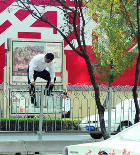 17日,一名男子在濼源大街艱難地翻越已經(jīng)加高的護欄。為了杜絕行人翻越護欄,交警部門加高了濼源大街部分路段護欄,但仍有個別人舊習(xí)難改。翻越者跨過了護欄,卻丟掉了安全意識和社會責(zé)任。