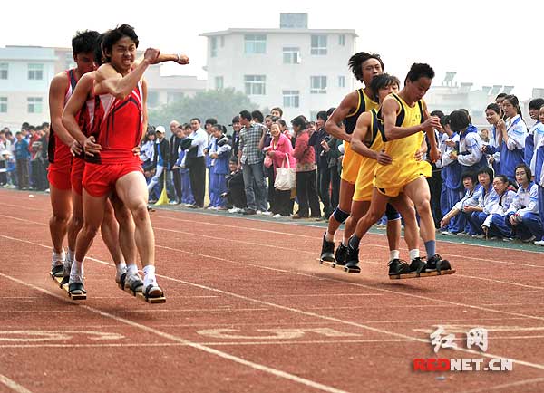(板鞋,三人六腳共穿一雙長(zhǎng)木鞋賽跑。)