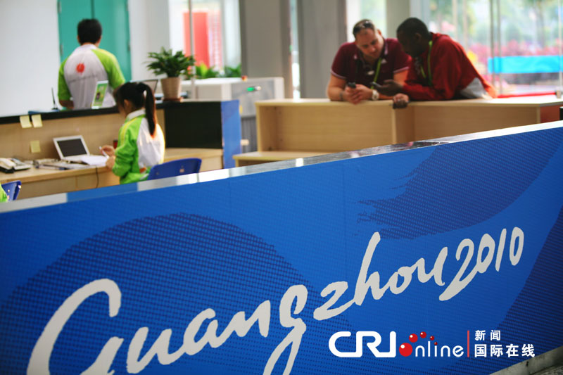 兩位卡塔爾運(yùn)動(dòng)員在運(yùn)動(dòng)員村歡迎中心注冊(cè)入。〝z影 饒彬彬)