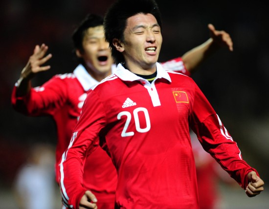 11月17日,中國隊球員楊旭(前)進球后慶祝。當(dāng)日,在昆明舉行的一場足球熱身賽中,中國隊以1比0戰(zhàn)勝拉脫維亞隊。新華社記者秦晴攝