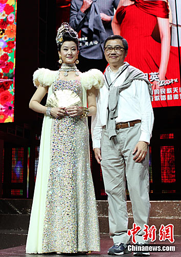大陸著名歌唱家宋祖英臺北小巨蛋演唱會將于5月8日舉行。5日下午,宋祖英以演唱會服裝造型在臺北小巨蛋舞臺亮相。宋祖英將有4套服裝外加一件斗篷,均由知名服裝設(shè)計師奚仲文(右)專門為本次演唱會量身打造,根據(jù)歌曲不同風(fēng)格而設(shè)計。中新社發(fā) 路梅 攝