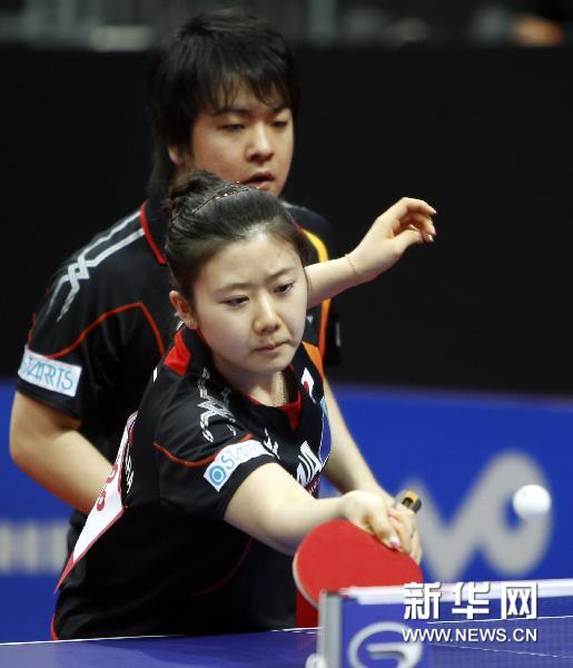 5月9日,日本選手岸川圣也(后)/福原愛在比賽中。當日,在荷蘭鹿特丹阿侯伊體育館舉行的2011年世界乒乓球(單項)錦標賽混雙首輪比賽中,岸川圣也/福原愛以4比0戰(zhàn)勝塞爾維亞選手茨雷普利亞/托多羅夫,晉級第二輪。新華社記者王麗莉攝