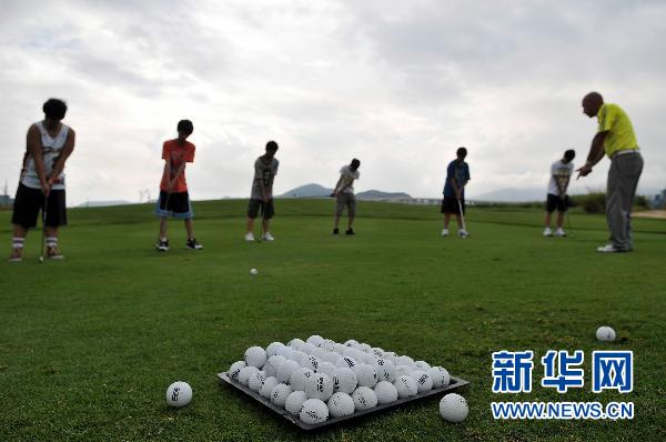 7月14日,一名老師在教學(xué)生高爾夫球基本技術(shù)。暑假期間,澳門特區(qū)體育發(fā)展局推出高爾夫球班,吸引眾多澳門學(xué)生參加學(xué)習(xí)。新華社記者張金加攝