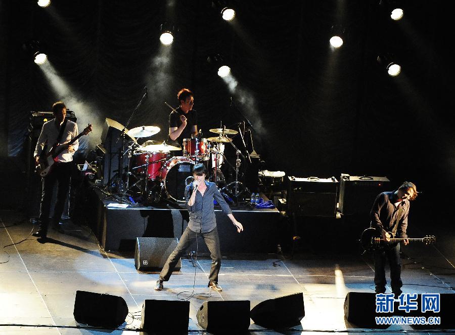 8月7日晚,樂隊(duì)主唱布萊特·安德森和樂隊(duì)演繹經(jīng)典歌曲。當(dāng)晚,著名英倫搖滾樂隊(duì)山羊皮(Suede)在北京工人體育館舉行了世界巡演中國站的首場(chǎng)演出,下一場(chǎng)將于9號(hào)在上海舉行。這次巡演是該樂隊(duì)在解散八年之后以經(jīng)典五人陣容重組后的首次巡演。新華社記者肖瀟攝