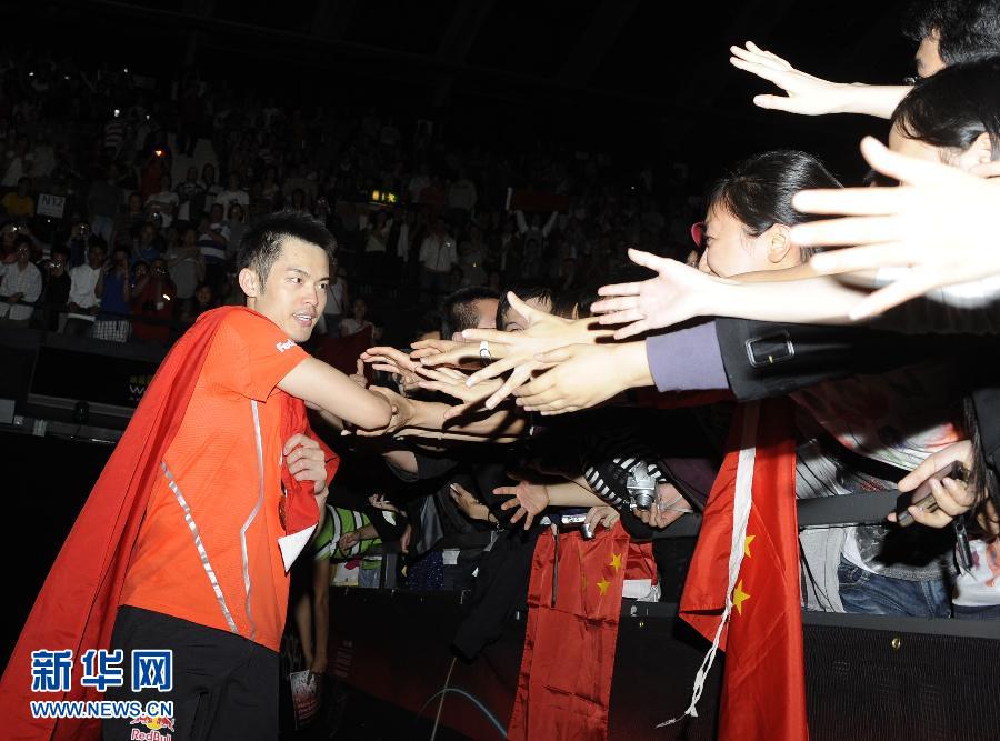 8月14日,林丹(左)接受祝賀。當(dāng)天,在英國(guó)倫敦舉行的2011年羽毛球世界錦標(biāo)賽男單決賽中,中國(guó)選手林丹以2比1戰(zhàn)勝馬來(lái)西亞選手李宗偉,第四次奪得世錦賽冠軍。新華社記者曾毅攝