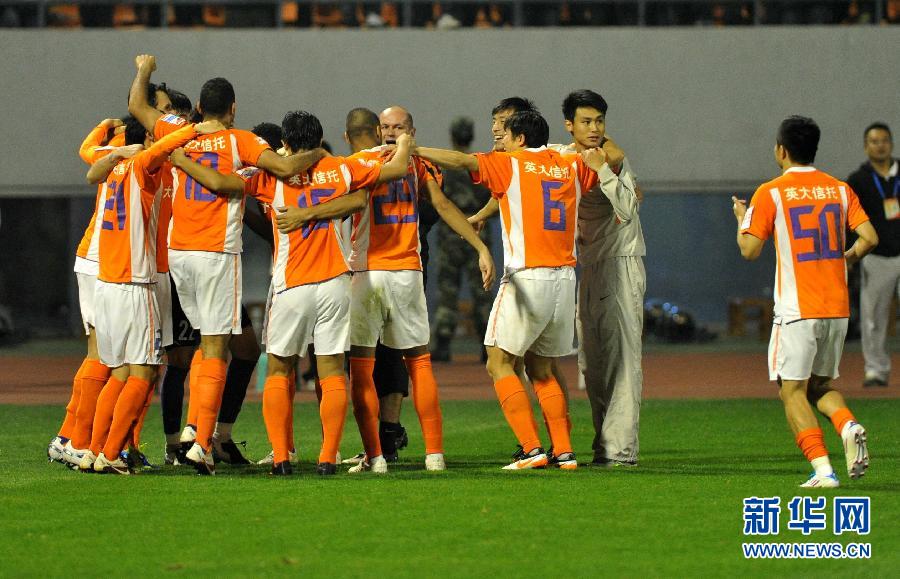 10月19日,山東魯能隊(duì)球員慶祝勝利。當(dāng)日,在2011中國足協(xié)杯半決賽中,山東魯能隊(duì)在主場通過點(diǎn)球大戰(zhàn),以4比3戰(zhàn)勝北京國安隊(duì),晉級決賽。 新華社記者徐速繪攝