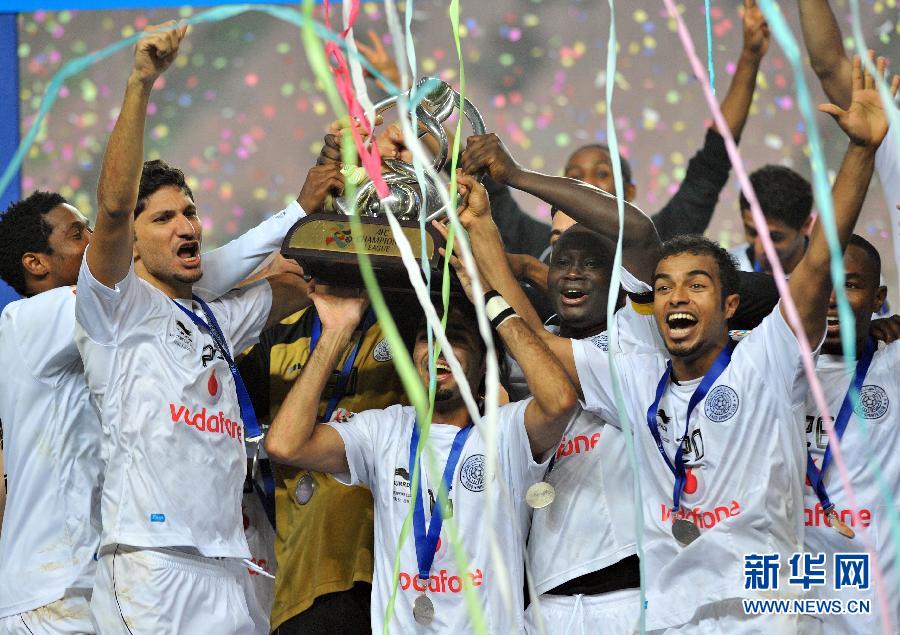 11月5日,阿爾薩德隊(duì)球員在頒獎(jiǎng)儀式上慶祝。當(dāng)日,2011賽季亞洲足球冠軍聯(lián)賽決賽在韓國(guó)全州舉行?ㄋ柊査_德隊(duì)通過(guò)點(diǎn)球大戰(zhàn),以6比4的總比分戰(zhàn)勝韓國(guó)全北現(xiàn)代隊(duì),獲得冠軍。新華社/法新