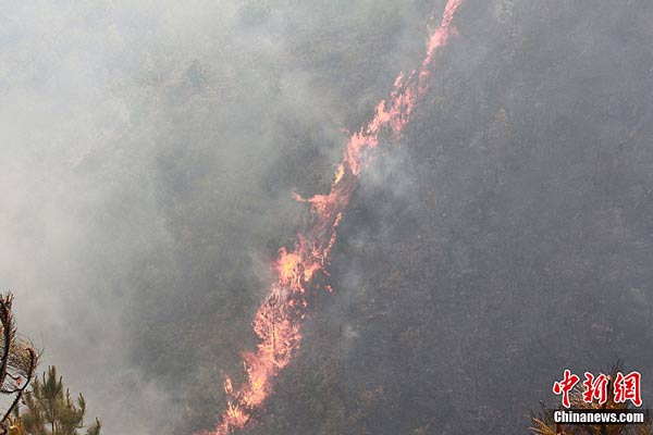 圖為,順山勢蔓延的一條火線。中新社發(fā) 楊潤民 攝