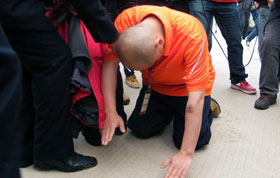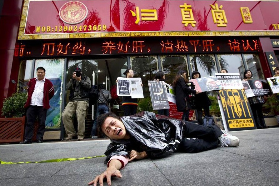 2012年2月26日下午,深圳,多名年輕的深圳市民以及來自深圳貓網(wǎng)站的網(wǎng)友和大學(xué)生在筍崗歸真堂店前向群眾宣傳“拒買熊膽制品,推動科學(xué)中藥健康發(fā)展”,他們一同喊出“我們愛中醫(yī),不愛熊膽,科學(xué)中藥不要殘酷熊膽”的心聲。一位網(wǎng)友穿著特別制作的熊服裝,在現(xiàn)場用行為藝術(shù)的方式表現(xiàn)熊被取膽的痛苦和殘酷。