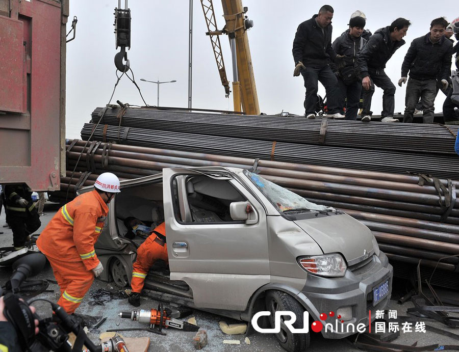 民警介紹,面包車內(nèi)共5人,鋼管掉落后,一人當場死亡,其余4人在附近行人和消防官兵的幫助下順利脫險。