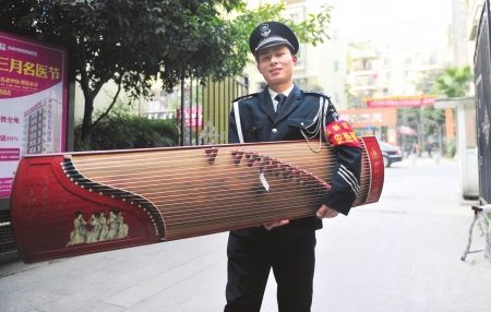 保安哥叫陳紅,遂寧人,身高1.7米左右,長相清秀,是個靦腆的小伙子,在小區(qū)里當保安一年多了。他說,平日里空閑的時間比較多,彈古箏是為了修煉自己浮躁的心情,凈化心靈?偙群炔琛⒋蚺苼泶虬l(fā)時間好。