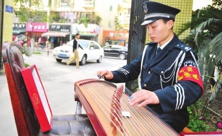 在小區(qū)門口彈古箏 保安哥十足文藝范兒