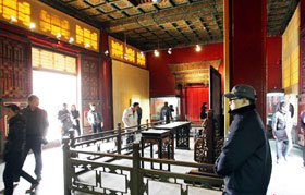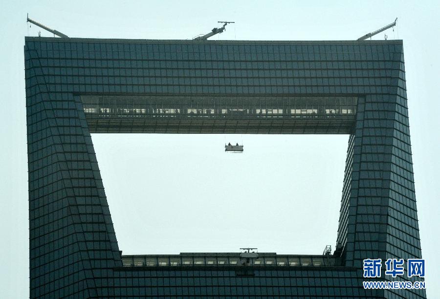 3月26日,上海環(huán)球金融中心高空作業(yè)清潔隊(duì)“高空超人”在94層至101層的風(fēng)洞調(diào)整擦窗機(jī)位置,進(jìn)行清洗。 新華社發(fā)