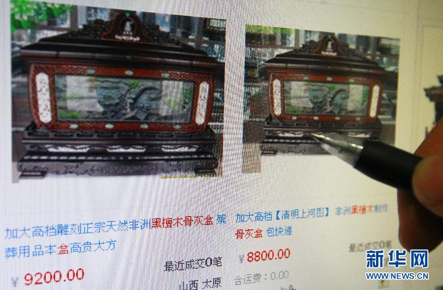 在淘寶網(wǎng)上,一個(gè)黑檀木骨灰盒的標(biāo)價(jià)高達(dá)9200元(3月30日攝)。 “100多元成本的骨灰盒標(biāo)價(jià)為2080元,利潤超過販毒”“殯儀館里幾乎見不到平價(jià)骨灰盒,不能這樣發(fā)‘死人財(cái)’吧?”…… 臨近清明節(jié),網(wǎng)絡(luò)上有關(guān)揭露殯葬暴利、尤其是骨灰盒暴利的網(wǎng)帖隨處可見。新華社“中國網(wǎng)事”記者針對(duì)網(wǎng)民詬病最多的“天價(jià)骨灰盒”問題進(jìn)行了調(diào)查,解開了一只出廠價(jià)數(shù)百元的普通骨灰盒變身為數(shù)萬元的“奢侈品”的“天價(jià)謎團(tuán)”。新華社記者 裴鑫攝