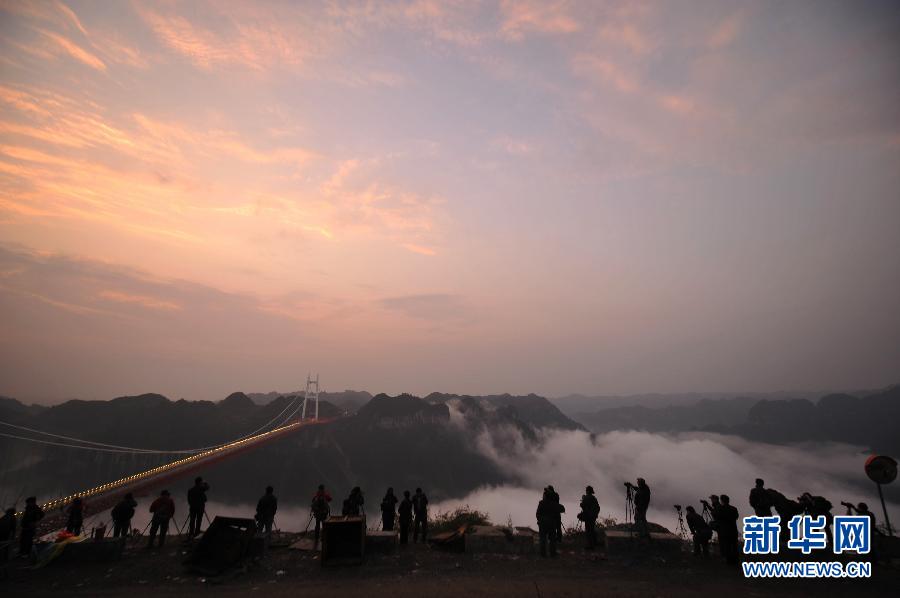 3月31日,幾位攝影愛好者在矮寨特大懸索橋一側的山頂拍攝。當日,湖南湘西矮寨特大懸索橋正式建成通車。矮寨特大懸索橋橋面設計標高與地面高差達335米左右,主跨1176米,是國家高速公路重點規(guī)劃的8條西部通道之一,也是長沙至重慶通道湖南段吉(首)茶(峒)高速公路中的重點工程和關鍵控制性工程,建成通車后將極大改善湘渝兩省市間的交通狀況。新華社記者 趙眾志 攝