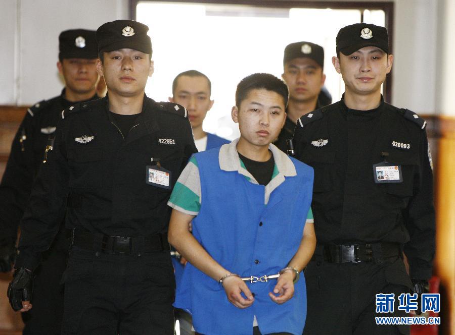 這是王海劍被帶入法庭(4月27日攝)。 27日9時(shí)許,武漢市中級(jí)法院開(kāi)庭審理“12·1”爆炸案,3名被告人出庭受審。去年12月1日,武漢一建設(shè)銀行支行門(mén)前發(fā)生爆炸,導(dǎo)致2死10多人傷。新華社發(fā) (李金星 攝)