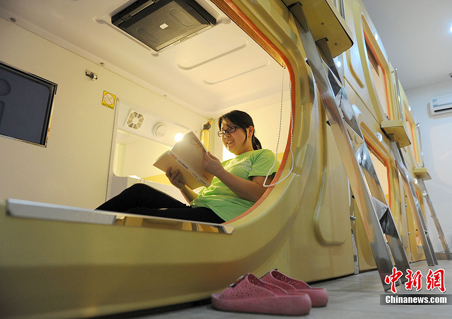 5月1日,中國(guó)首家獲得營(yíng)業(yè)執(zhí)照的“太空艙”賓館亮相西安,旅客爆滿。該賓館按照12星座設(shè)置了9區(qū)共86個(gè)“艙位”,其中名為“獅子座”的區(qū)域?qū)9┐蝼耸渴褂。圖為艙內(nèi)旅客在看書(shū)。張遠(yuǎn) 攝