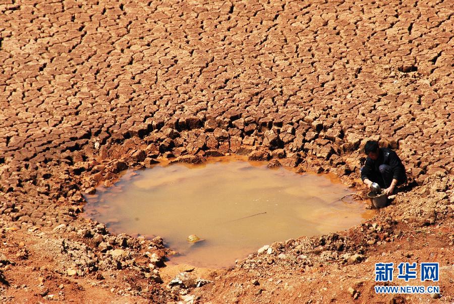 5月20日,一名男子在貴州省威寧縣海拉鄉(xiāng)一座因干旱幾近干涸的水庫里取水。