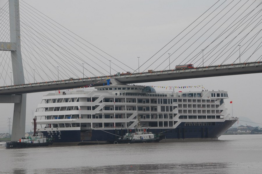 5月23日上午,溫州一艘七層樓高大型郵輪在甌江被拖輪拖引經(jīng)過(guò)溫州大橋時(shí),頂部與大橋發(fā)生碰撞,郵輪頂部?jī)勺鶡焽璧炔课槐弧跋鳌钡。王凌?
