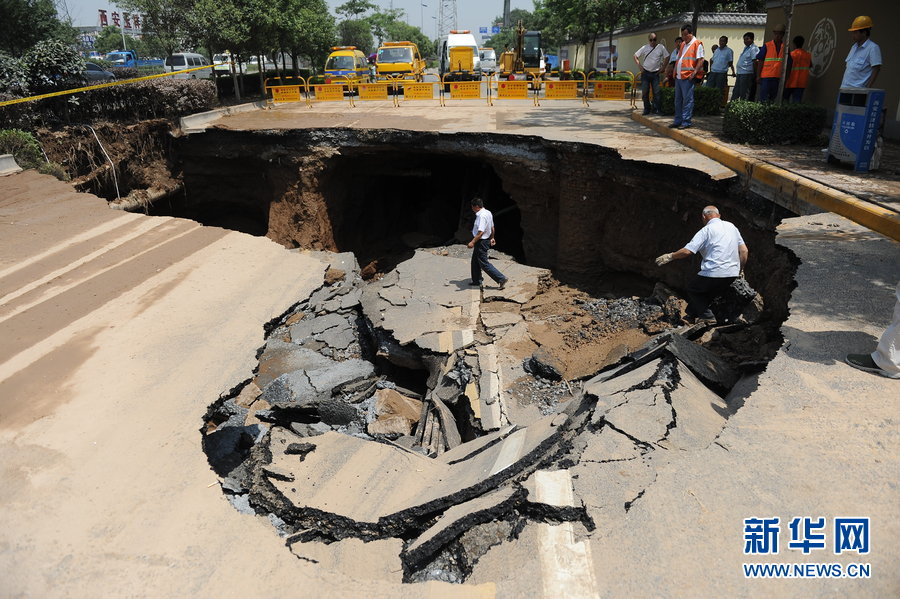 2012年5月27日,陜西省西安市朱宏路塌出一個(gè)長(zhǎng)約15米,寬約10米,深約6米的大坑。